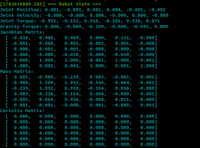 This callback is invoked periodically once realtime monitoring is started, and it prints a timestamp based on the local system clock, joint positions, joint velocities, joint torques, gravity torques, and dynamic matrices (Jacobian, Mass, Coriolis).